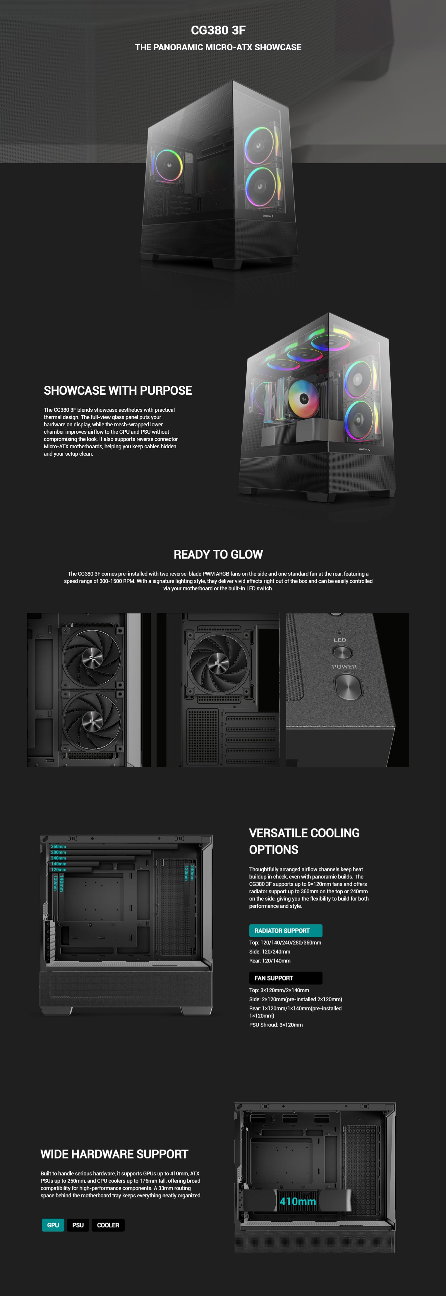 The CG380 3F is a panoramic Micro-ATX case that combines form and function in a space-efficient footprint. With three pre-installed PWM ARGB fans, it’s a great choice for building a vibrant showcase with reliable airflow.   Product Dimensions: 437×235×451mm(L×W×H) Net Weight: 6.83kg Materials: ABS+SPCC+Tempered Glass Motherboard Support: ITX/Micro-ATX Micro-ATX(Rear Connector) Front I/O Ports: USB3.0 x2/Gen2…